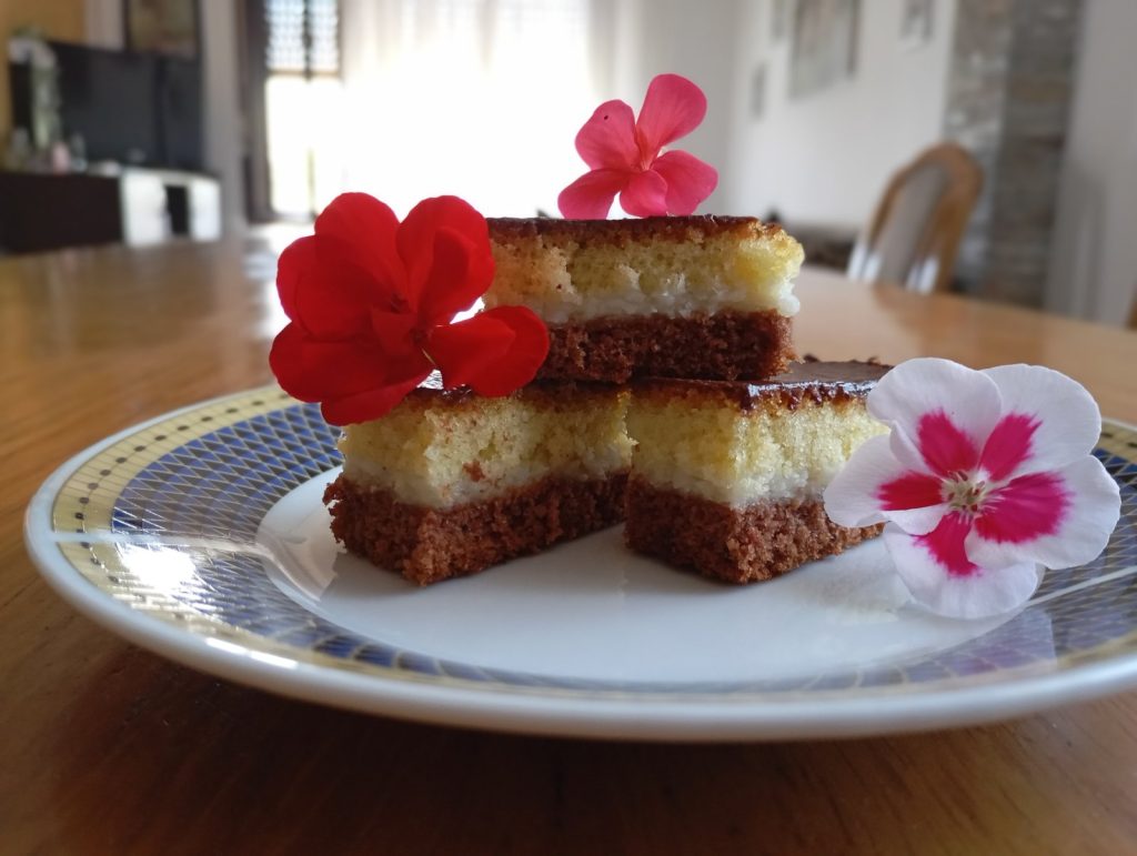 Uzmite pleh dimenzija 35×20 cm i obložite ga pek papirom. Sipajte tamnu smesu od kakaa i stavite u zagrejanu rernu na 180 stepeni da se zapeče do pola, oko 10 minuta. U međuvremenu pripremite kokos krem.